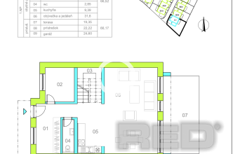 Prízemie: vstupná chodba so šatníkom, technická miestnosť, samostatné WC, priestranná kuchyňa prepojená s obývacou izbou s výstupom do záhrady