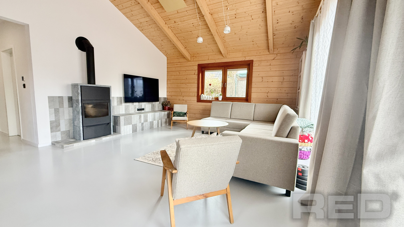 Veľkoformátové okná s výstupom do záhrady prirodzene presvetľujú obytný priestor a vytvárajú príjemné prepojenie interiéru s exteriérom.