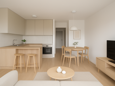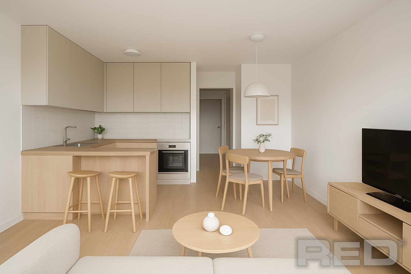 Dispozične sa skladá zo vstupnej chodby, šatníka, kuchyne spojenej s obývačkou a dvoch spální, kúpeľne a toalety.  Súčasťou bytu je balkón. K bytu patrí pivničná kobka.